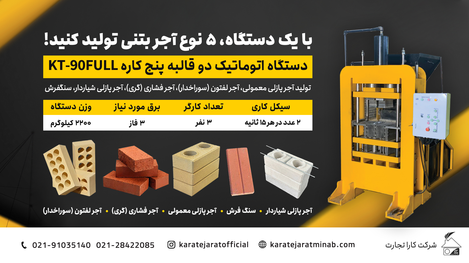 به شرکت کارا تجارت میناب سازنده و مخترع دستگاه های صنعتی تولید انواع مصالح ساختمانی، بدون نیاز به کوره خوش آمدید.شرکت ما سالهاست در بازار محصولات ساختمانی کار می کند و در سال ۱۳۹۶ برای اولین بار در ایران آجر نما پازلی و بلوک نما پازلی را به ثبت صنعتی و اختراع رسانده ایم و بصورت کاملا انحصاری و رسمی در کشور شروع به تولید دستگاه های تولید آجر نما پازلی و بلوک نما پازلی بدون نیاز به کوره و پخت کرده ایم.این محصولات ساختمانی جدید و مدرن هزینه های ساختمان سازی را تا ۳۰درصد کاهش خواهند داد. در حال حاظر در کل کشورمان با این محصول صدها ساختمان ، سوله ، دیوار ، آلاچیق ، شومینه و موارد دیگر ساخته شده است. محصولات ما الزامات استاندارد ملی ایران در حوزه مصالح ساختمانی را تامین نموده است.همچنین شرکت کارا تجارت سایر تجهیزات ساخت محصولات بتنی، مانند دستگاه های تولید بلوک سیمانی پازلی که نما میباشد،دستگاه تولید آجرفشاری(گری) و دستگاه تولید آجرلفتون(سوراخدار) را تولید میکنیم که همگی با تکنولوژی عدم نیاز به کوره و پخت، بدون آلودگی زیست محیطی میباشند.